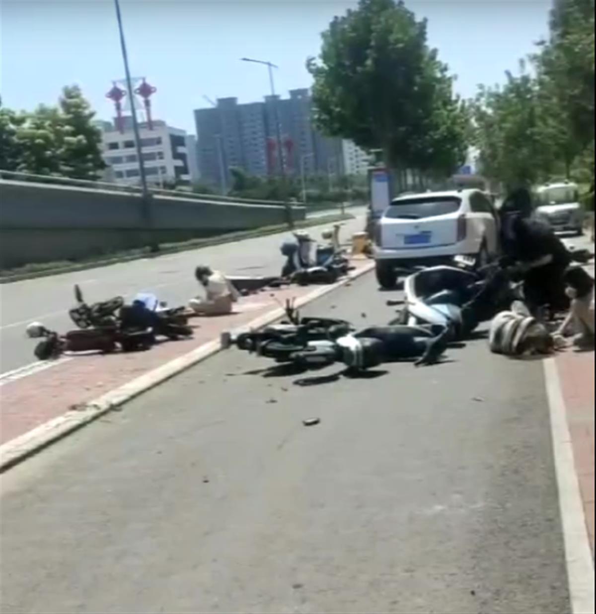 当地市民高先生告诉极目新闻记者,8月10日下午3时许,济宁市荷花路附近发生了这样一起交通事故,一辆SUV撞倒多辆电动自行车,多人受伤。