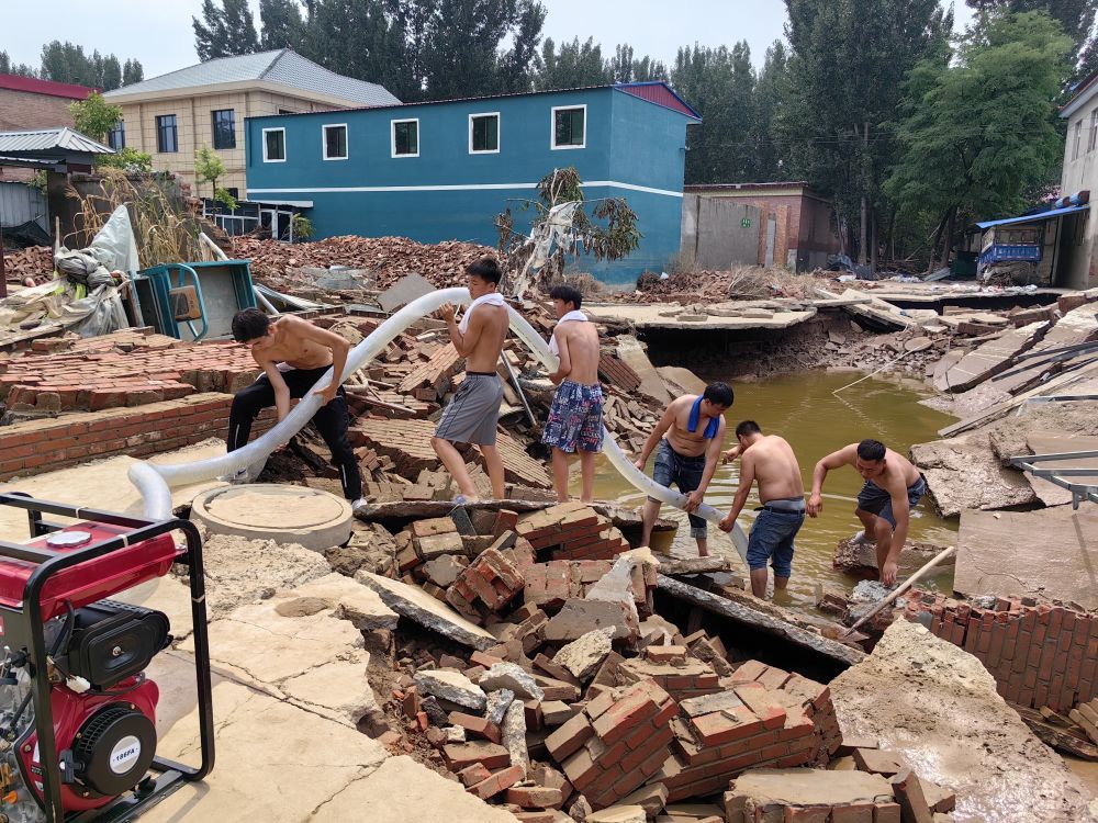 涿州市刁窝镇西茨村的青壮年志愿者正在抽水排涝。 新华社记者闫起磊 摄