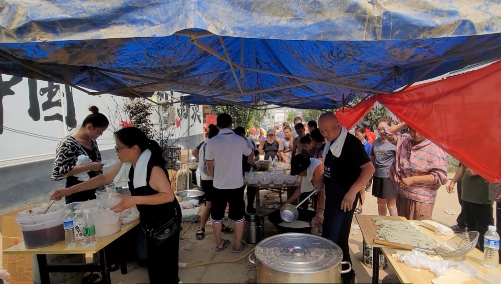 午饭时分,在西茨村村口一侧的临时饭点,志愿者从临时搭建的铁锅中,盛出一碗碗热汤烩面,捧给排队村民。这是涿州市城区一家烩面馆免费给村民提供的。