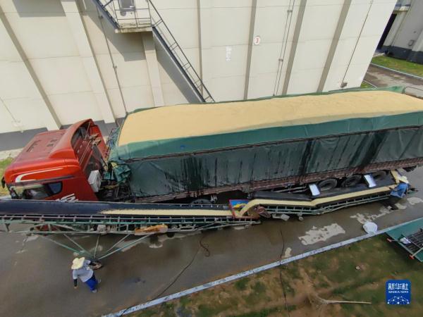 在江西省南昌县横岗国家粮食储备库,种粮大户开仓卸载粮车上的早稻(8月8日摄)。