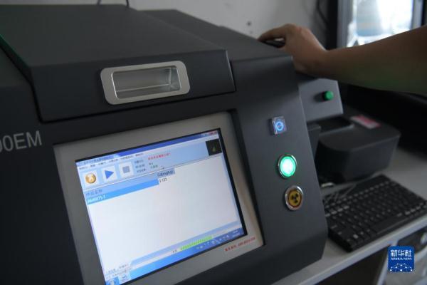 在江西省南昌县横岗国家粮食储备库,工作人员通过设备检测抽样粮食的水分、品质、农药残余、重金属等情况(8月8日摄)。