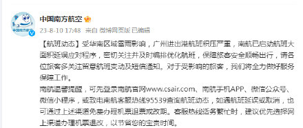 8月10日傍晚,@中国南方航空发布消息称,受华南区域雷雨影响,广州进出港航班积压严重,南航已启动航班大面积延误应对程序,密切关注并及时编排优化航班,保障旅客安全顺畅出行,请各位旅客多关注留意航班变动及短信通知。文/记者:李妍