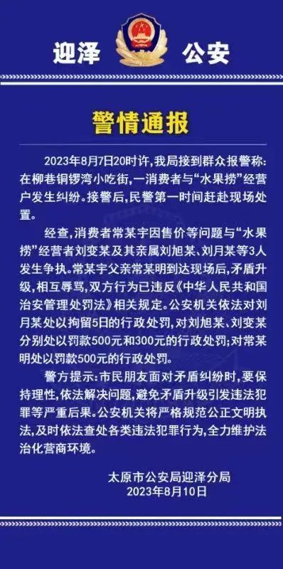 山西日报记者王宇报道8月10日,太原市公安局迎泽分局发布警情通报,2023年8月7日20时许,该局接到群众报警称:在柳巷铜锣湾小吃街,一消费者与“水果捞”经营户发生纠纷。接警后,民警第一时间赶赴现场处置。