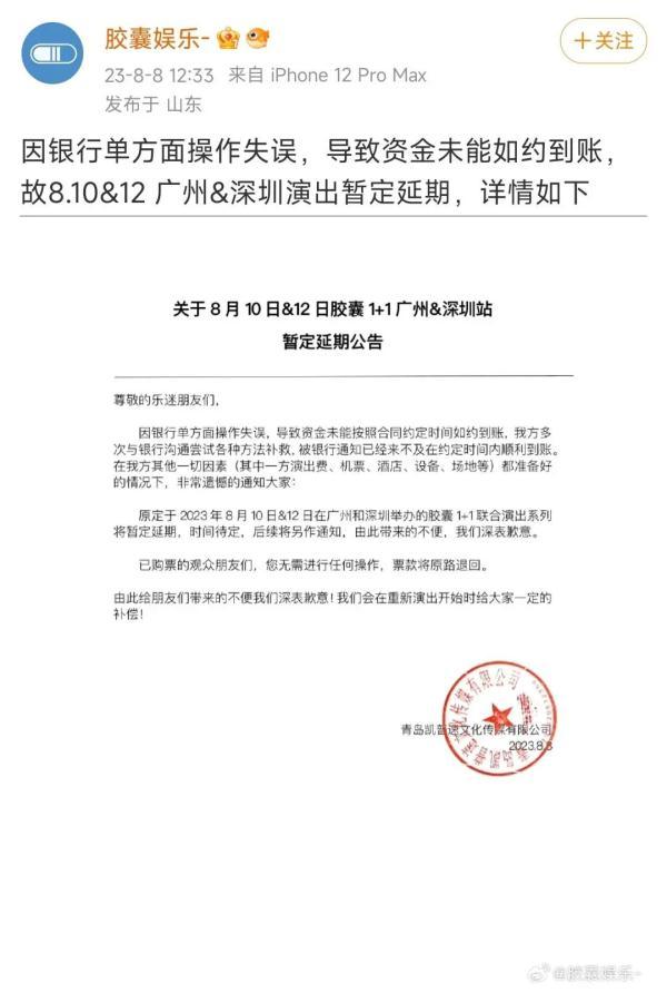“胶囊娱乐”宣布另一演出延期。微博截图