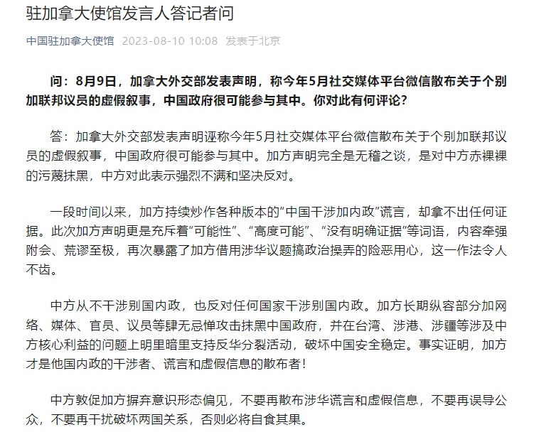中国驻加拿大使馆10日驳斥道:一段时间以来,加方持续炒作各种版本的“中国干涉加内政”谎言,却拿不出任何证据。此次加方声明更是充斥着“可能性”“高度可能”“没有明确证据”等词语,内容牵强附会、荒谬至极,再次暴露了加方借用涉华议题搞政治操弄的险恶用心,这一做法令人不齿。