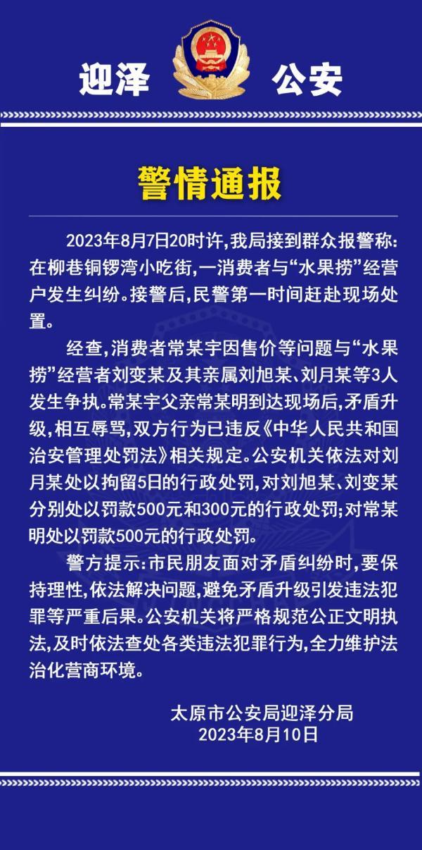 据山西省太原市公安局迎泽区分局微博消息,8月10日,太原市公安局迎泽分局发布警情通报称,2023年8月7日20时许,该局接到群众报警称:在柳巷铜锣湾小吃街,一消费者与“水果捞”经营户发生纠纷。接警后,民警第一时间赶赴现场处置。