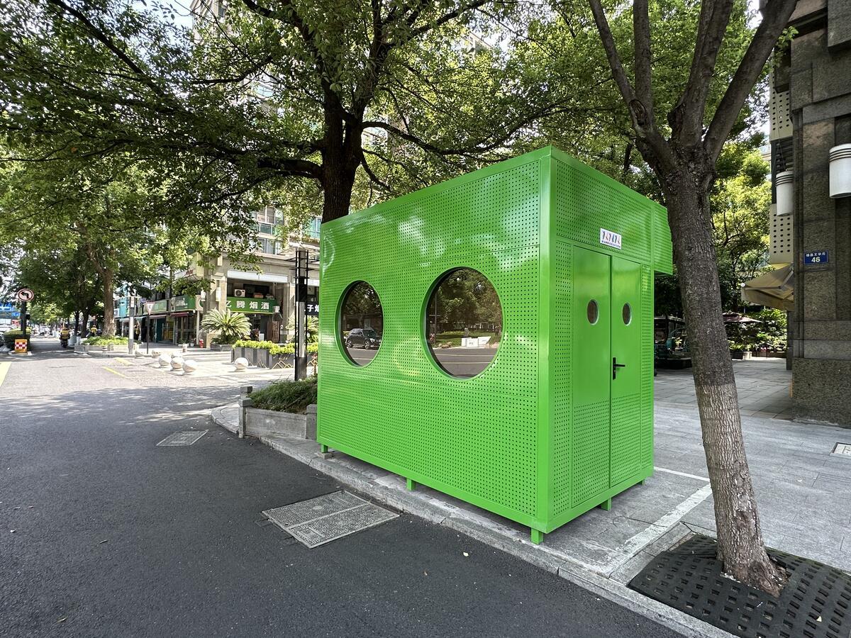 浙江在线记者接到线索后第一时间来到现场,看到了王先生口中的“绿色小亭子”。它位于金华南路上,锦昌文华小区出口的右侧。整体外观四四方方,左侧有两根灰色烟囱的设计,里头空荡荡的,还没有任何设施。小区保安告诉记者,它叫“微笑亭”,是上周刚来的“新面孔”,现在还未投入使用。