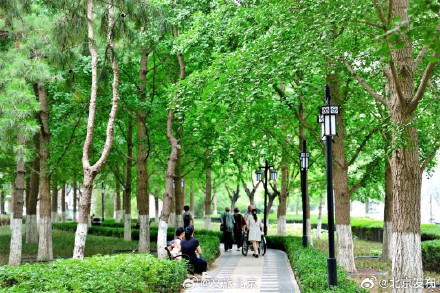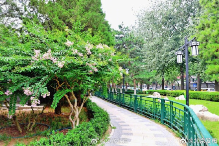 如今,红墙墙面被鲜艳的“中国红”取代,庄严美丽。广场上,花岗岩地面铺设一新,老人们聊天散步,孩子们嬉笑玩耍。大树下,新栽植了玉簪、大花萱草、连钱草等耐阴植物,玉簪花正值花期,姿态清秀,花朵洁白如玉,散发淡淡花香。沿着公园里健步慢行系统南行,感到舒适、安全。大路上铺设的是花岗岩,走起来轻快不累脚,小路则使用了透水砖,方便实用。每间隔15米新增了一个古朴的庭院灯,还有星星点点的地灯,让夜晚游园不再摸黑。