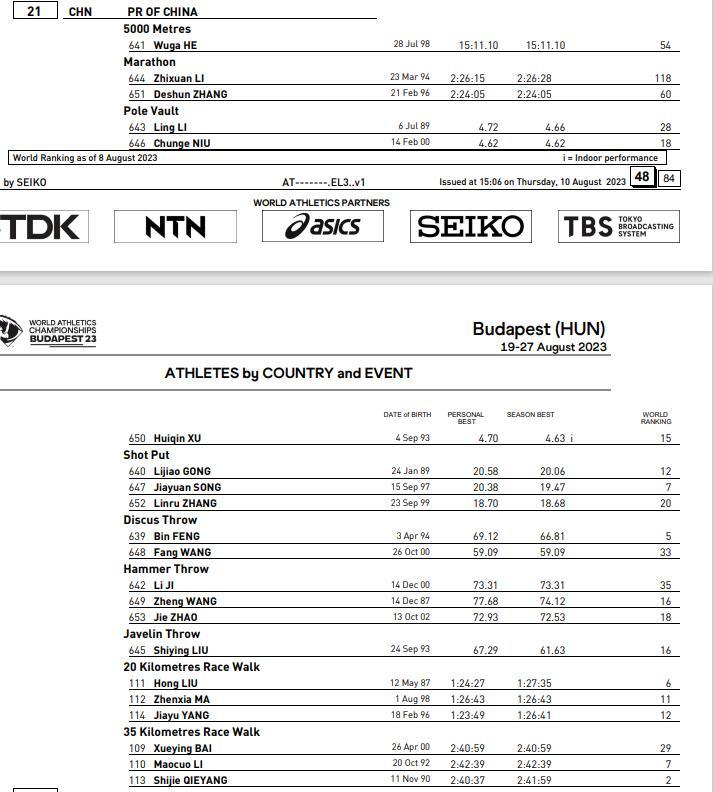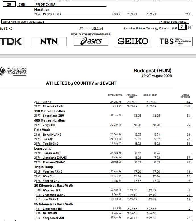 人民网北京8月11日电 (记者杨磊)近日,世界田联更新了2023年布达佩斯田径世锦赛参赛名单。中国队共有20名男子选手和21名女子选手获得参赛资格。