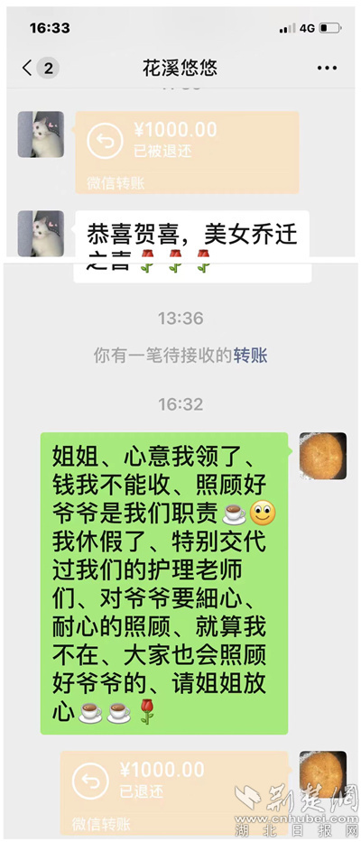 荆楚网(湖北日报网)讯(记者叶修颀 通讯员刘惠林)8月9日下午,孝感市第一人民医院爱心护理院护理班长余定英的手机屏幕突然亮了一下,原来是一个微信红包被退还的消息提醒。在这个红包的背后,上演了一场感人的护理故事。