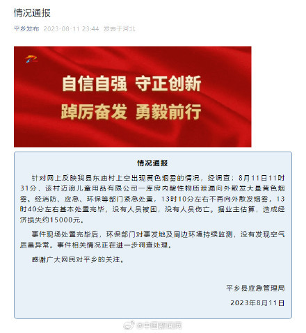 河北平乡县应急管理局11日通报:针对网上反映我县东庙村上空出现黄色烟雾的情况,经调查:8月11日11时31分,该村迈浪儿童用品有限公司一库房内酸性物质泄漏向外散发大量黄色烟雾。经消防、应急、环保等部门紧急处置,13时10分左右不再向外散发烟雾,13时40分左右基本处置完毕,没有人员被困,没有人员伤亡。据业主估算,造成经济损失约15000元。事件现场处置完毕后,环保部门对事发地及周边环境持续监测,没有发现空气质量异常。(平乡发布)