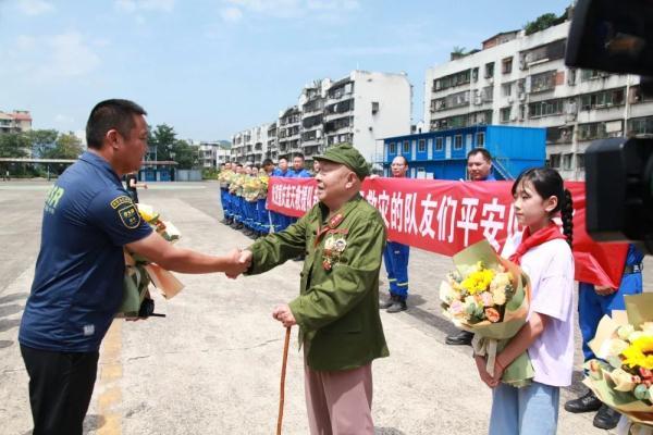 8月11日,少先队员、老兵代表为蓝天救援队队员送上鲜花。通讯员 冯涛摄