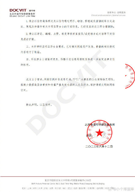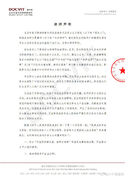 邓亚萍@小个邓亚萍12日发布律师声明:有关“邓亚萍涉嫌贪腐、被带走调查”等消息纯属造谣污蔑,邓亚萍女士予以强烈谴责。
