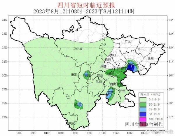 据四川省气象台8月12日8时发布的短时临近预报,8月12日08~14时,成都、雅安、乐山、眉山、资阳、内江、自贡、宜宾、泸州、遂宁、南充、广安12市及绵阳、德阳2市西部有阵雨或雷雨,部分地方中到大雨,遂宁、南充、广安3市局部有暴雨,盆地其余地方多云间晴;川西高原大部和攀西地区阴天间多云有阵雨或雷雨,凉山州局部有中到大雨。