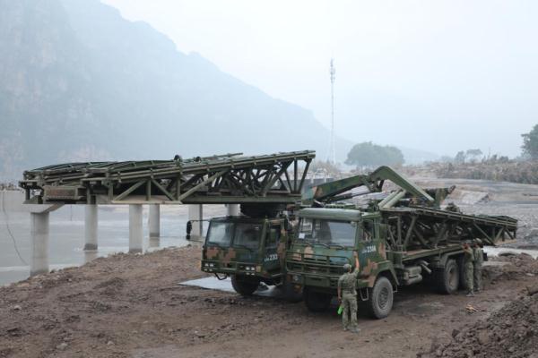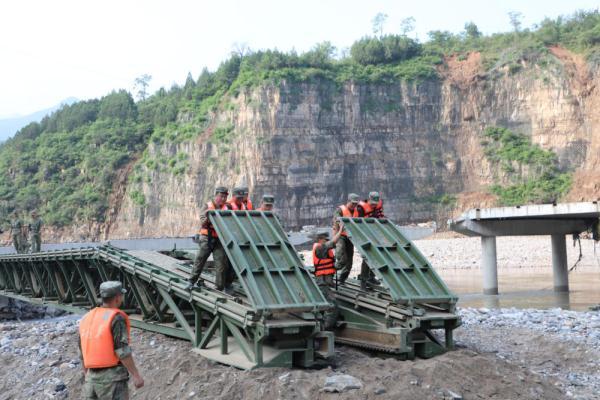 ↑8月8日,陆军第82集团军某工兵旅官兵在北京市房山区十渡镇北石门村北石门桥段架设重型支援桥。新华社记者李晓明 摄