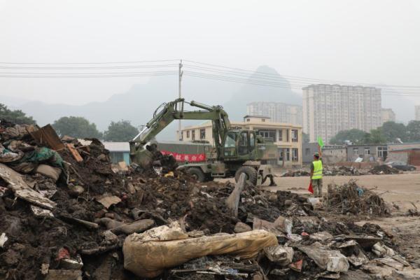 ↑8月11日,陆军第82集团军某工兵旅官兵在北京市房山区河北镇磁家务村清理泥土和垃圾。新华社记者李晓明 摄