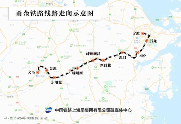 甬金铁路东起甬台温铁路云龙站,途经宁波市、绍兴市,向西终至沪昆铁路金华市义乌站,新建正线全长约188.3公里,全线设云龙、奉化、溪口、新昌北、嵊州新昌、嵊州西、东阳北、苏溪、义乌9个车站,设计时速160公里,预留200公里时速条件,为双线客货共线的I级电气化铁路。
