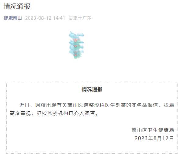 近日,网络出现有关南山医院整形科医生刘某的实名举报信。我局高度重视,纪检监察机构已介入调查。