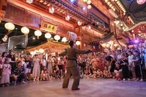 在长安十二时辰主题街区的仿唐市井街巷上,一个身着古装的“卖艺人”大声招呼游客,蹬伞、顶缸、抖杠等绝活精彩亮相,引起游客阵阵叫好。