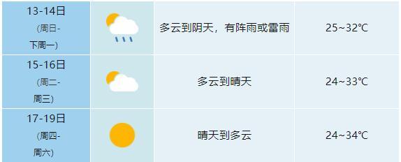 14日:淮北地区多云,沿淮淮河以南多云到阴天有阵雨或雷雨。