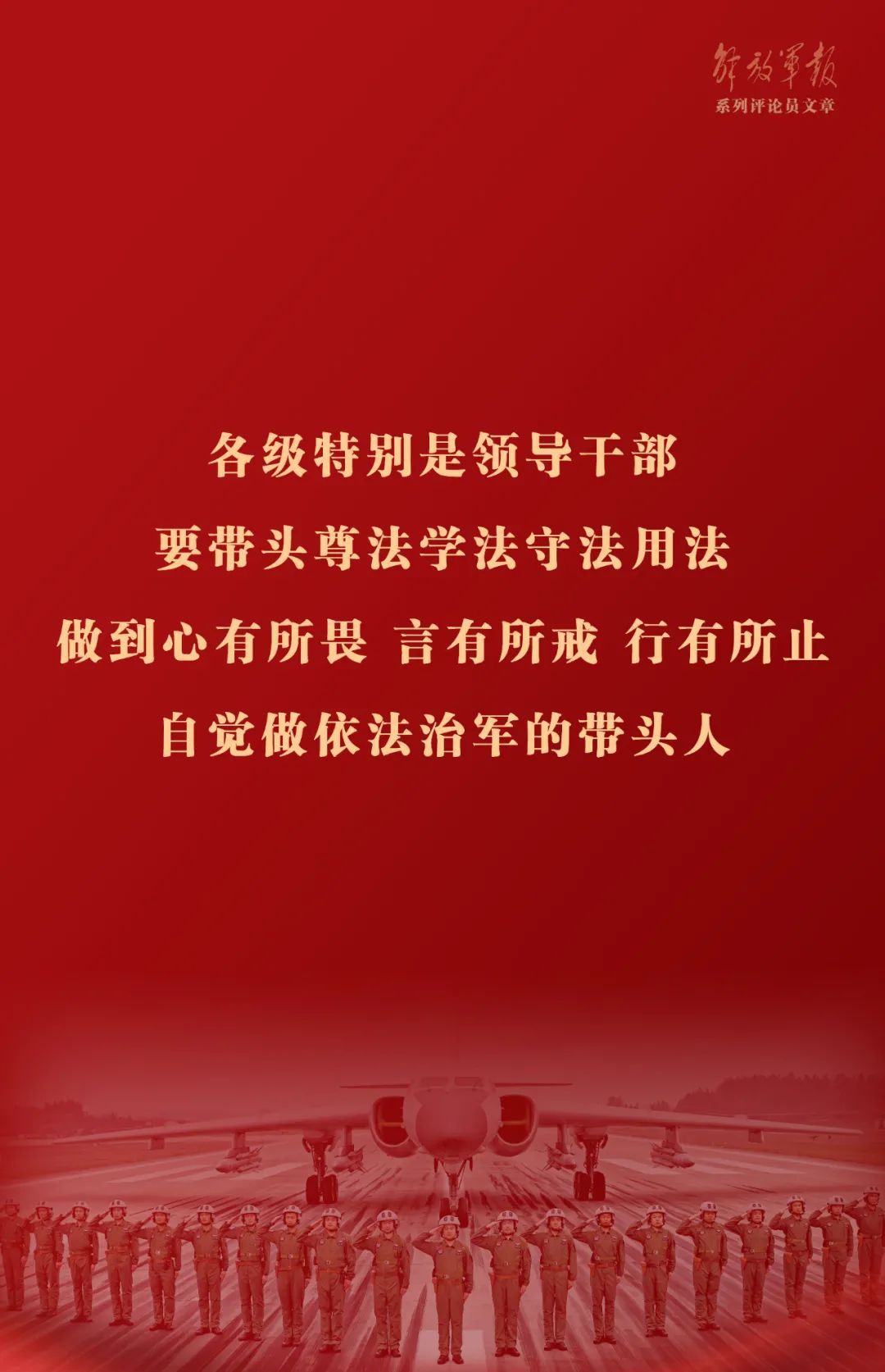 依法治官、依法治权,是依法治军的关键。各级特别是领导干部要带头尊法学法守法用法,做到心有所畏、言有所戒、行有所止,自觉做依法治军的带头人。努力学习法律法规和条令条例,明确法律红线,严格按原则、按政策、按规矩、按程序办事,按规则正确用权、谨慎用权、干净用权,想问题、作决策、办事情都要纳入法治轨道,确保权力在法治轨道上运行。