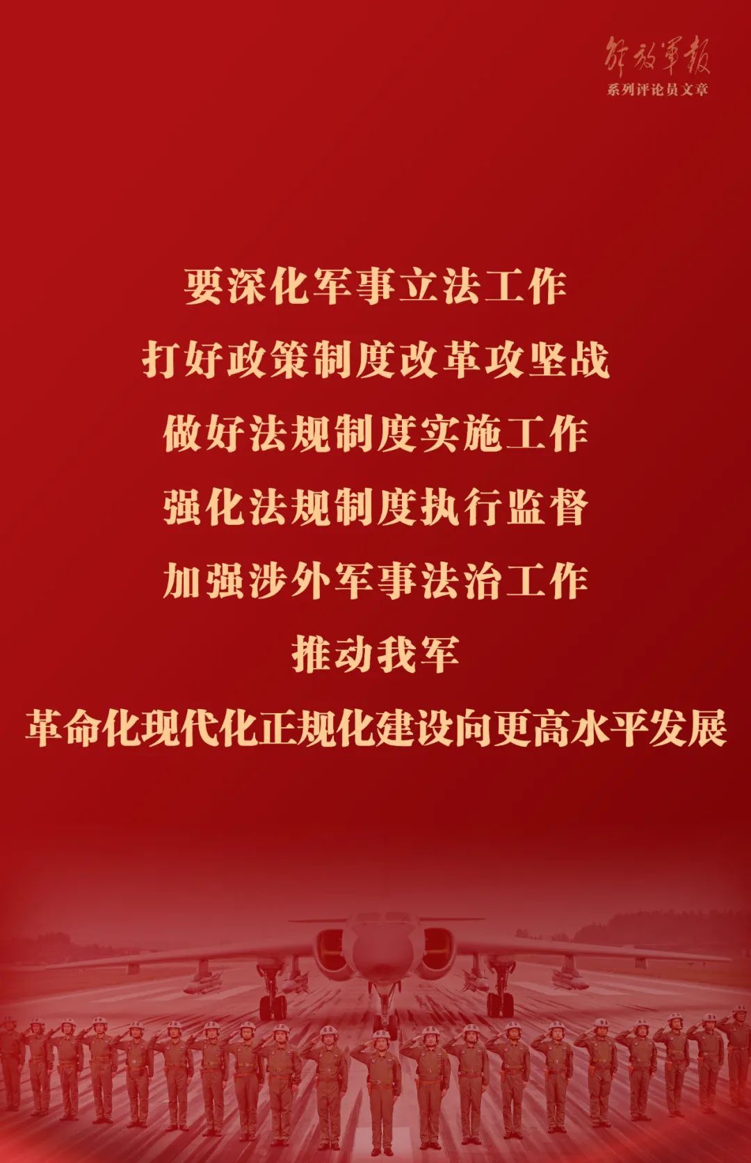 军队越是现代化,越是信息化,越是要法治化。党的二十大提出,要加强依法治军机制建设和战略规划,完善中国特色军事法治体系。全军要全面贯彻依法治军战略,统筹全局、突出重点,以重点突破带动整体推进。要深化军事立法工作,打好政策制度改革攻坚战,做好法规制度实施工作,强化法规制度执行监督,加强涉外军事法治工作,推动我军革命化现代化正规化建设向更高水平发展。(作者:李煊 孙智英)