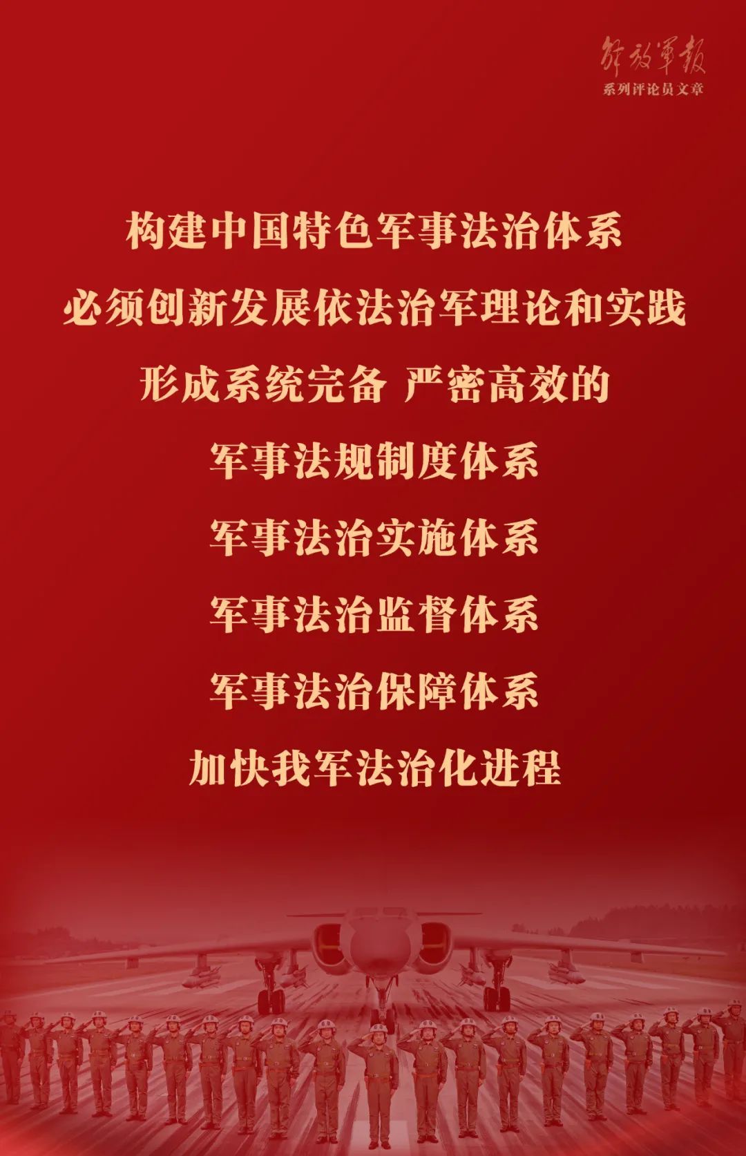 以良法促进发展、保障善治。构建中国特色军事法治体系,必须创新发展依法治军理论和实践,形成系统完备、严密高效的军事法规制度体系、军事法治实施体系、军事法治监督体系、军事法治保障体系,加快我军法治化进程。