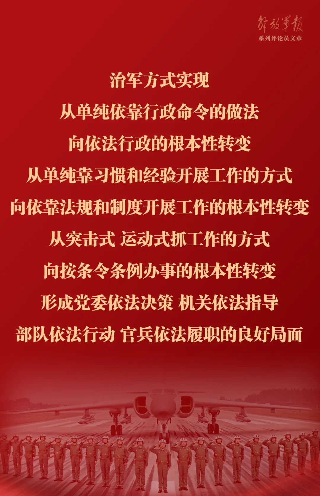 提高国防和军队建设法治化水平,要求治军方式发生一场深刻变革,实现从单纯依靠行政命令的做法向依法行政的根本性转变,从单纯靠习惯和经验开展工作的方式向依靠法规和制度开展工作的根本性转变,从突击式、运动式抓工作的方式向按条令条例办事的根本性转变,形成党委依法决策、机关依法指导、部队依法行动、官兵依法履职的良好局面。