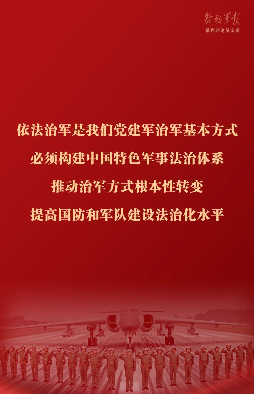 “依法治军是我们党建军治军基本方式,必须构建中国特色军事法治体系,推动治军方式根本性转变,提高国防和军队建设法治化水平”。习近平强军思想这一重要内涵,深刻回答了强军兴军的法治保障这个重大问题。