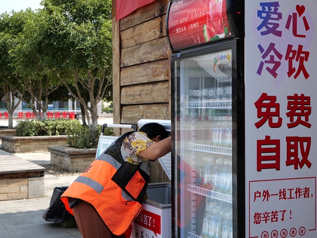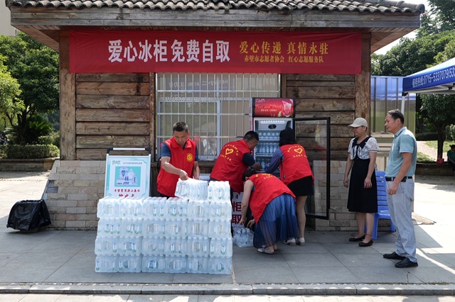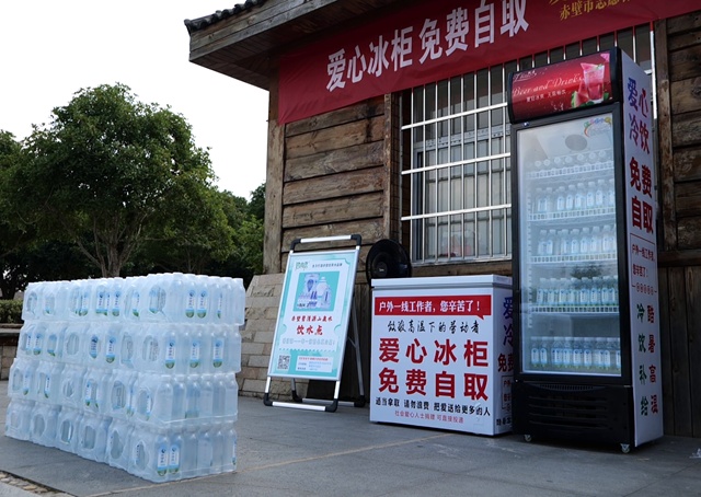 8月9日,赤壁市委文明办、市志愿者协会在赤壁北站环卫工人小木屋旁上线“爱心冰柜”,两台冰柜四周贴着醒目的“爱心冰柜 免费领取”红字提示语,里面摆满了冰凉的饮用水,供户外劳动者们自行取用。
