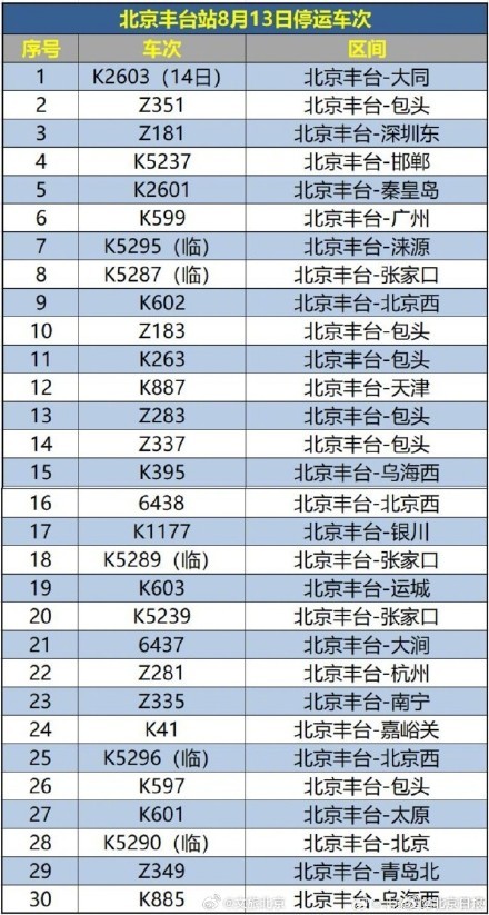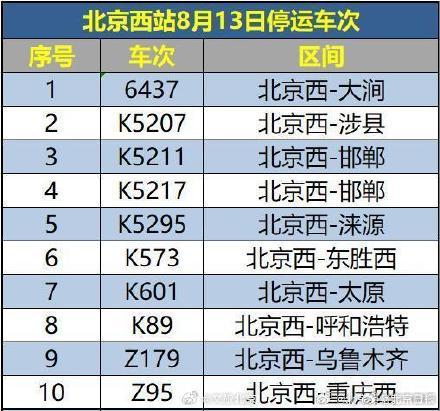 据@北京西站官方微博,受水害影响,8月13日北京西站、北京丰台站部分列车停运,已购买停运列车车票的旅客,可于30日内办理全额退票手续。请广大旅客合理安排出行,关注铁路部门公告。