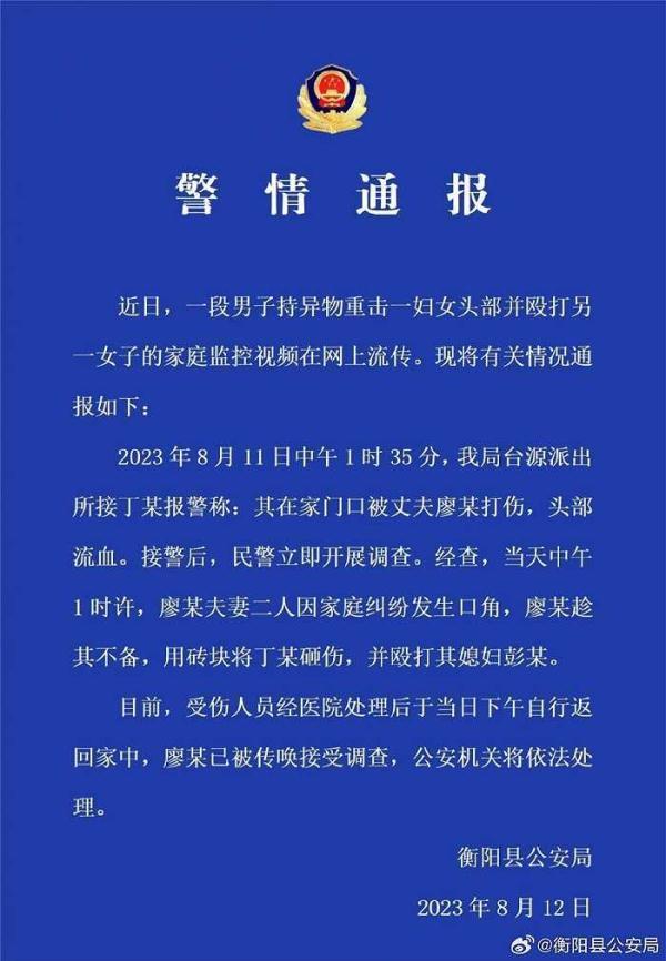 8月11日中午1时35分,台源派出所接丁某报警称:其在家门口被丈夫廖某打伤,头部流血。接警后,民警立即开展调查。经查,当天中午1时许,廖某夫妻二人因家庭纠纷发生口角,廖某趁其不备,用砖块将丁某砸伤,并殴打其媳妇彭某。目前,受伤人员经医院处理后于当日下午自行返回家中,廖某已被传唤接受调查,公安机关将依法处理。