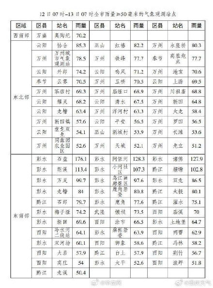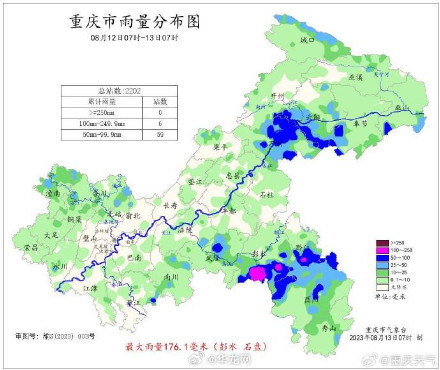 8月12日07时—13日07时,重庆市东部部分地区出现大雨到暴雨,局地大暴雨。最大雨量出现在彭水县石盘乡,为176.1毫米;最大小时雨量78.4毫米(彭水县石盘乡,13日04时)。彭水县、黔江区2个区县的6个雨量站达大暴雨,万州区、云阳县、奉节县、巫山县、武隆区、彭水县、黔江区、酉阳县8个区县和万盛经开区的59个雨量站达暴雨。(重庆天气)