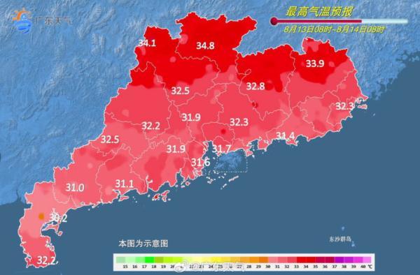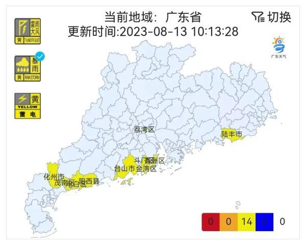 8月13日,粤东市县有大雨到暴雨,局部大暴雨,粤西市县大雨,局部暴雨,珠江三角洲南部市县有中到大雨,局部暴雨,其余市县多云,有(雷)阵雨,局部大雨或暴雨。中北部市县最高气温有所回升,最高气温:粤北市县33℃~35℃,其余市县30℃~33℃。
