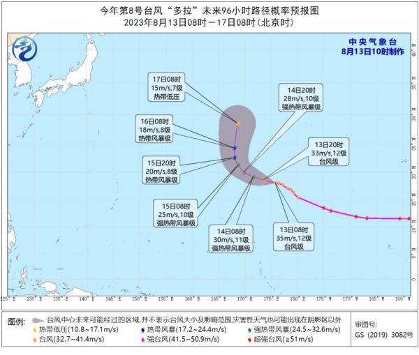 今年第8号台风“多拉”(DORA)(台风级)的中心今天(13日)上午8点钟位于美国关岛偏东方向约3350公里的西北太平洋洋面上,,中心附近最大风力有12级(35米/秒)。预计,“多拉”将以每小时20公里左右的速度向西偏北方向移动,强度逐渐减弱。
