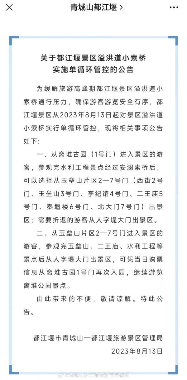 为缓解旅游高峰期都江堰景区溢洪道小索桥通行压力,确保游客游览安全有序,都江堰景区从2023年8月13日起对景区溢洪道小索桥实行单循环管控,现将相关事项公告如下: