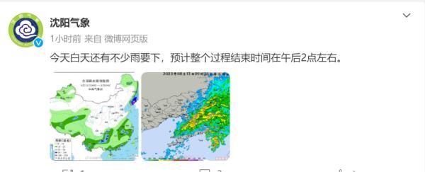 沈阳市气象台预计,今天降雨过程在午后2点左右结束。