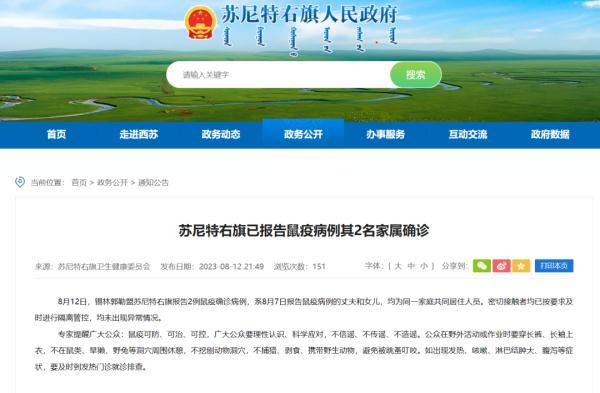 内蒙古锡林郭勒盟苏尼特右旗政府官网发布通知公告,8月12日,苏尼特右旗报告2例鼠疫确诊病例,系8月7日报告鼠疫病例的丈夫和女儿,均为同一家庭共同居住人员。密切接触者均已按要求及时进行隔离管控,均未出现异常情况。