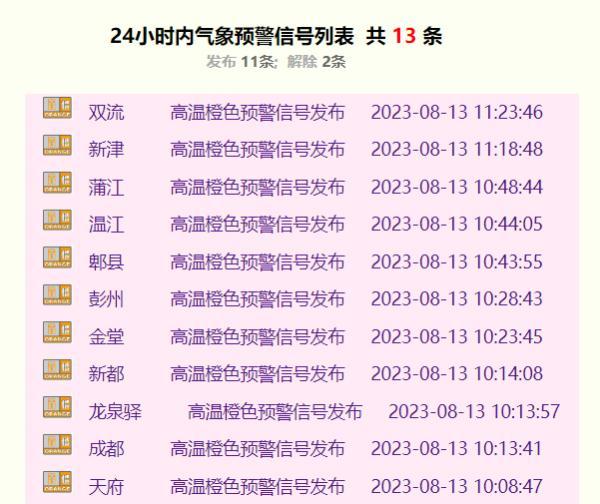 成都市气象台2023年08月13日10时00分发布高温橙色预警信号:预计成都市锦江区、青羊区、金牛区、武侯区、成华区、青白江区、高新西区、东部新区、高新南区的所有镇(街道)未来24小时内最高气温将升至35℃以上。高温时段主要出现在13日13时至18时。请注意防范高温带来的不利影响。