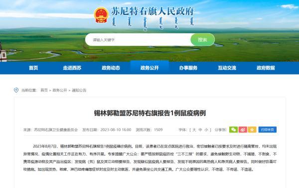 此前,8月7日,锡林郭勒盟苏尼特右旗报告1例鼠疫确诊病例。目前,该患者已在定点医院进行救治,密切接触者已按要求及时进行隔离管控,均未出现异常情况,疫情处置相关工作正在有力、有序开展。