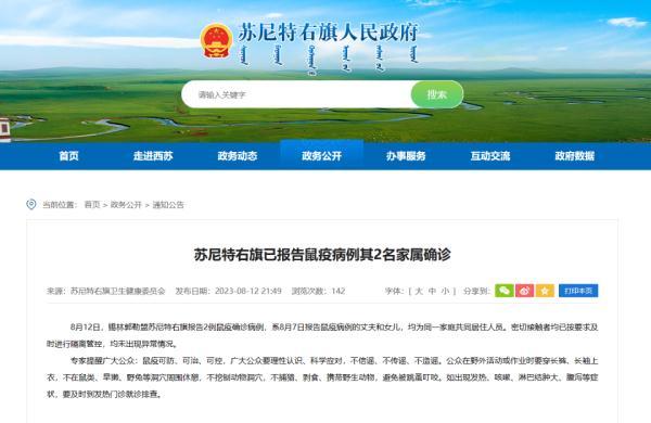 据内蒙古锡林郭勒盟苏尼特右旗政府网站消息,8月12日,锡林郭勒盟苏尼特右旗报告2例鼠疫确诊病例,系8月7日报告鼠疫病例的丈夫和女儿,均为同一家庭共同居住人员。密切接触者均已按要求及时进行隔离管控,均未出现异常情况。