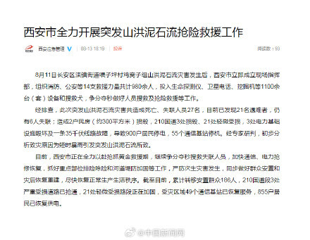 经排查,此次突发山洪泥石流灾害共造成死亡、失联人员27名,目前已发现21名遇难者,仍有6人失联;造成2户民房(约300平方米)损毁,210国道3处损毁、21处轻微受损,3处电力基础设施毁坏及一条35千伏线路故障,导致900户居民停电,55个通信基站停机。经专家研判,初步分析致灾原因为短时暴雨引发突发山洪泥石流所致。目前,西安市正在全力以赴抢抓黄金救援期,继续争分夺秒搜救失联人员,加快通信、电力抢修恢复,抓好重点部位排险除险和河道堤防加固等工作,严防次生灾害发生,同步做好群众安置和灾后恢复重建,尽快恢复正常生产生活秩序。