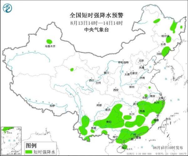 预计8月13日14时至14日14时,黑龙江中部、吉林北部和东南部、辽宁东北部、安徽中南部、湖北东部、湖南西部和南部、江西、浙江、福建西北部和东部、重庆东南部、贵州、云南、广西北部和东部、广东、海南岛东部等地的部分地区将有短时强降水天气,最大小时雨量30~50毫米,局地可达60毫米以上。预计,强对流的主要影响时段为今日午后至夜间。