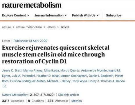 ⑥Exercise rejuvenates quiescent skeletal muscle stem cells inold mice through restoration of Cyclin D1, Nature Metabolism(2020).http://med.stanford.edu/
