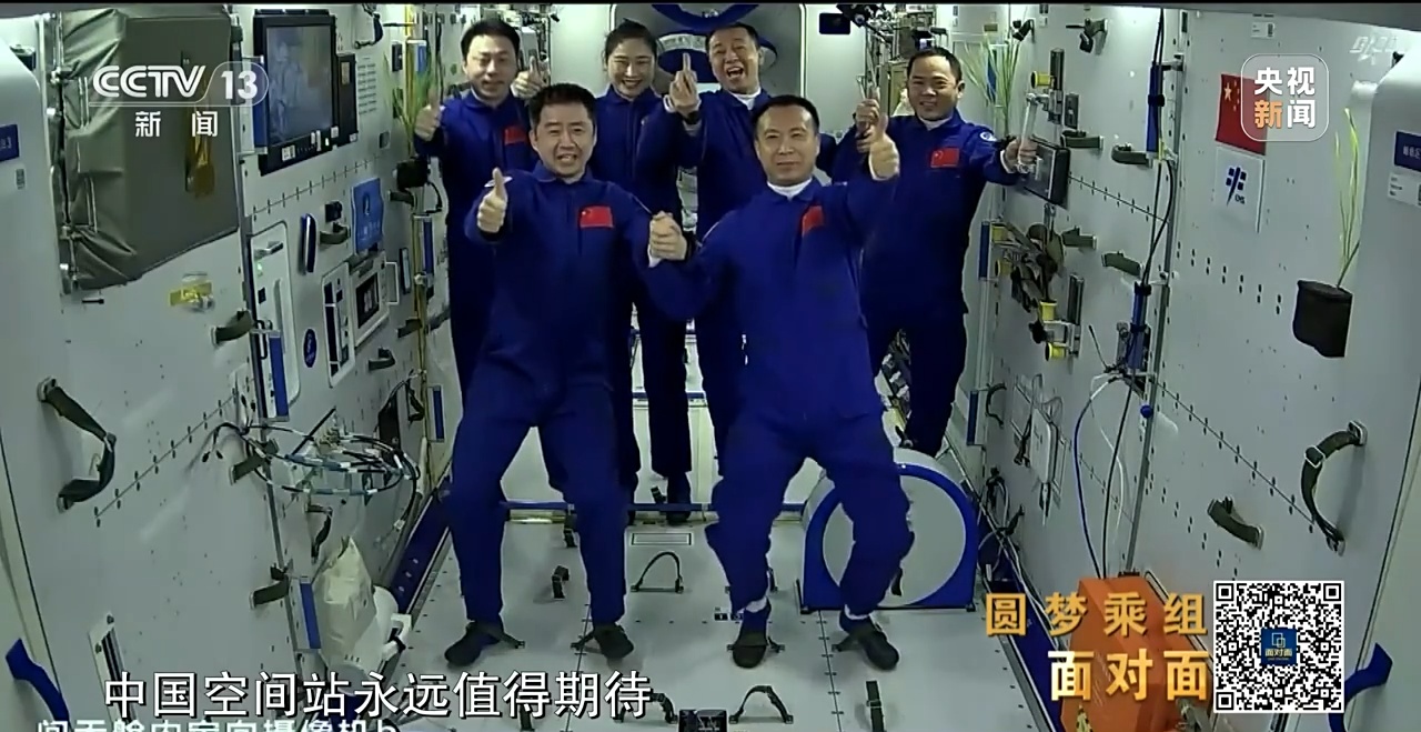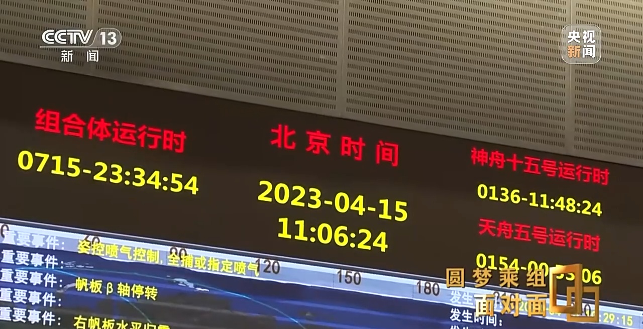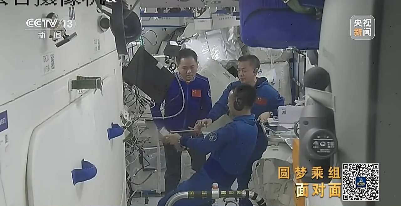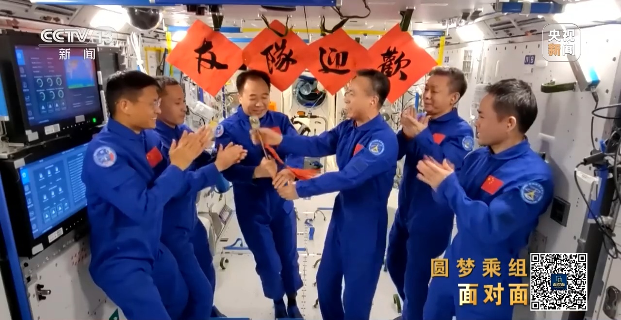 2023年5月30日,神舟十五号乘组顺利打开“家门”,欢迎远道而来的神舟十六号乘组入驻“天宫”。2023年6月2日,神舟十五号、神舟十六号乘组在空间站进行了交接仪式,神舟十五号乘组跑完了空间站建造阶段的最后一程,又把空间站进入应用与发展阶段的第一棒交到了神舟十六号乘组手中。第二天,神舟十五号乘组作别空间站和队友,启程返回地球。
