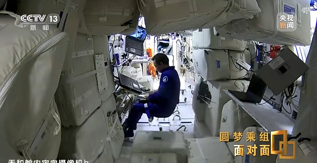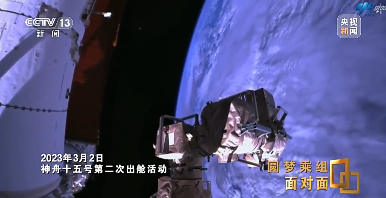 这是他们首次漫步太空,费俊龙携带设备和工具搭乘大小机械臂组合臂在舱段间进行转移,张陆则沿舱壁爬行至作业点。