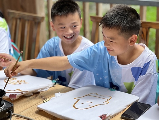 孩子们在布依村寨体验“枫香染”。受访者供图
