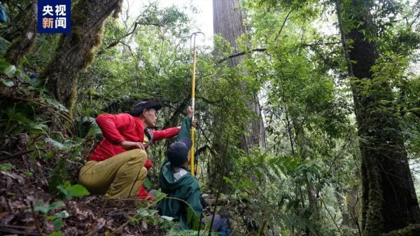这里有一个插曲,由于树是长在斜坡上,因此还要确定树干基部露出地面的最高点和最低点,最终,科学家得出藏南柏木Ⅱ号高度为99.5米。
