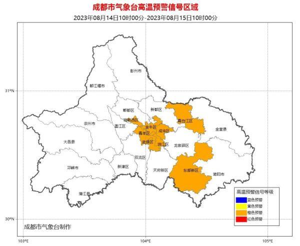 截至今日10时00分,天府新区、新都、龙泉驿、彭州、金堂、温江、郫都、蒲江、新津和双流的高温橙色预警信号仍在生效中,大邑和崇州已发布高温橙色预警信号,其余区(市)县将根据气温发展情况,适时发布高温预警信号。