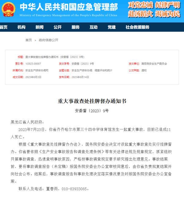 2023年7月23日,你省齐齐哈尔市第三十四中学体育馆发生一起重大事故,目前已造成11人死亡。